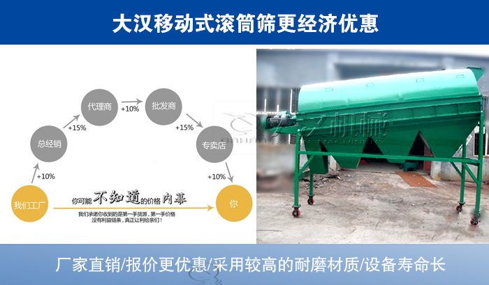 2、廠家采用薄利多銷經(jīng)營理念,單臺移動式滾筒篩利潤更低,因此設(shè)備報價更優(yōu)惠;