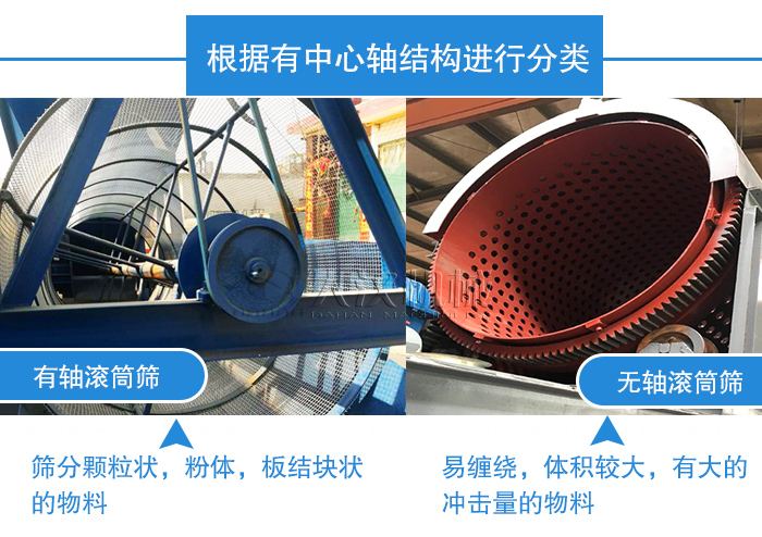 滾筒篩可以分為有軸滾筒篩與無軸滾筒篩,這兩者的區(qū)別在于其中心軸,其中有軸的滾筒篩可以篩分顆粒狀,粉體,板結(jié)塊狀的物料,而無軸滾筒篩采用無軸設計,可以對易纏繞,體積較大,有大的沖擊量的物料的篩分與篩選。