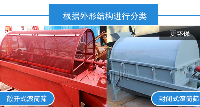 可以分為封閉式滾筒篩與敞開式(籠式滾筒篩),封閉式的滾筒篩可以保護周圍環(huán)境的干凈,同時也可以保護篩分的物料不受外界環(huán)境的影響。