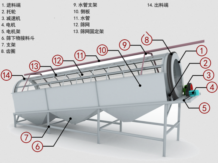 石英砂滾筒篩主要由電機、減速機、滾筒裝置、機架、密封蓋、進出料口等部分組成。滾筒裝置是核心部件,各部件協同工作保證整臺機器的正常運行。