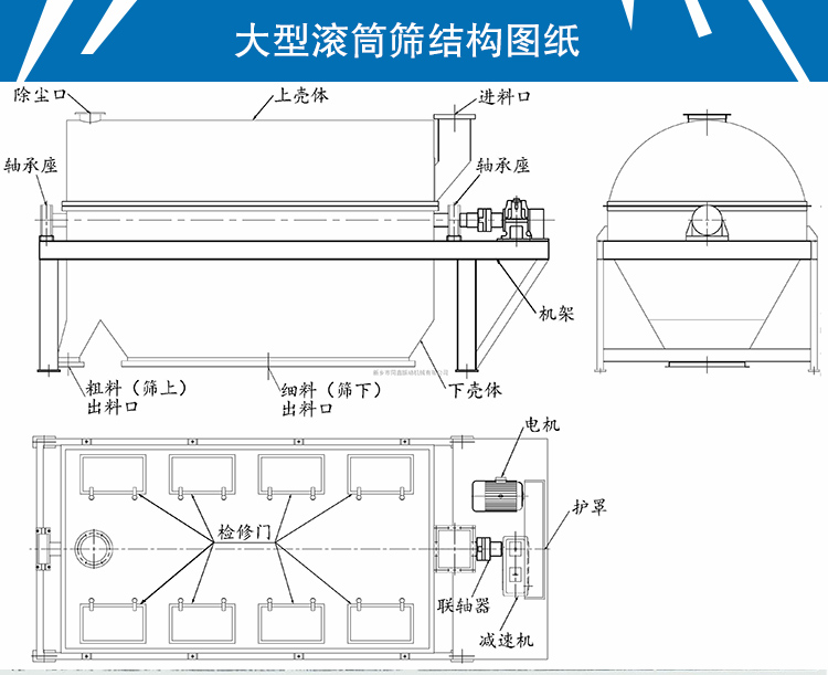 大型滾筒篩主要有電機(jī)、減速機(jī)、滾筒裝置、機(jī)架、密封蓋、進(jìn)出料口組成。滾筒裝置傾斜安裝于機(jī)架上。電動機(jī)經(jīng)減速機(jī)與滾筒裝置通過聯(lián)軸器連接在一起,驅(qū)動滾筒裝置繞其軸線轉(zhuǎn)動。
