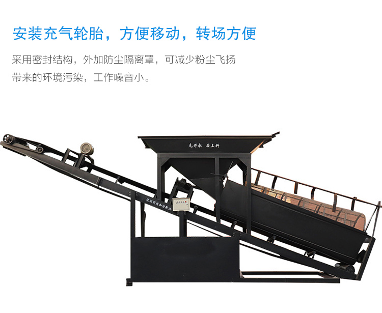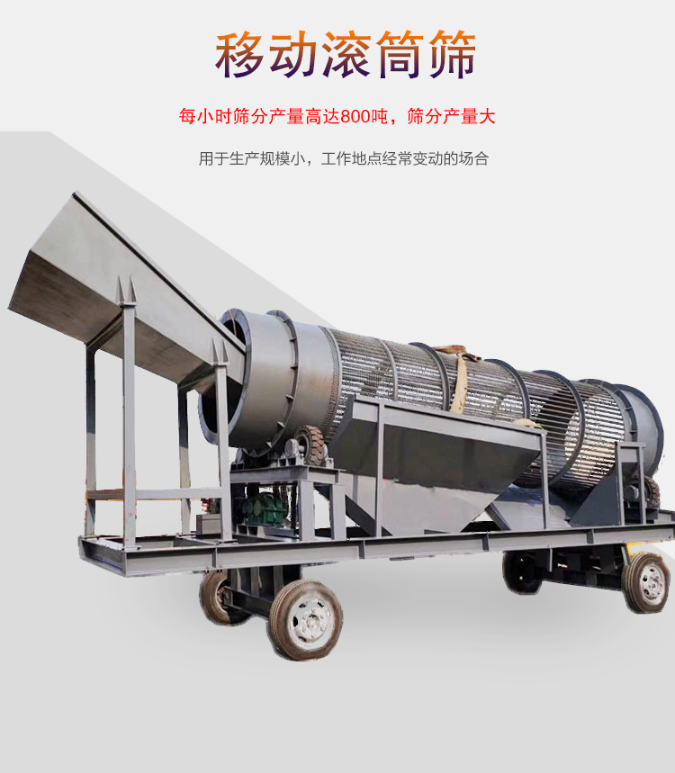 移動滾筒篩是在滾筒篩底部加裝了充氣輪胎,主要用于生產規模小,工作地點經常變動的場合。