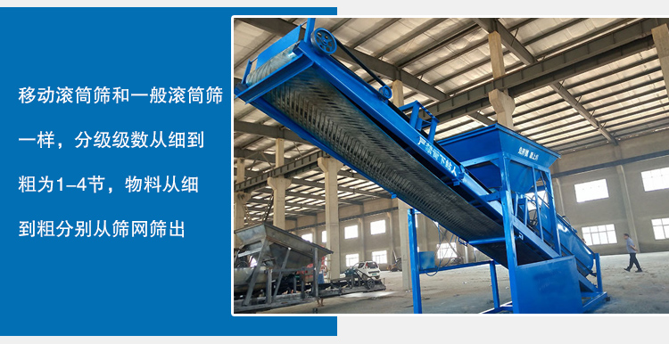 移動滾筒篩和一般滾筒篩一樣,分級級數從細到粗為1-4節,物料從細到粗分別從篩網篩出,大于篩網孔徑的物料從出料口排出,破碎的石料進入滾筒后,一方面隨著滾筒轉動而被篩選,一方面粒度大的石料沿著滾筒的斜度向前流動,通過不同網目的篩網被篩出,不大的石料篩出后通過各自的漏斗流出,由人工運送或自流進送至成品堆。