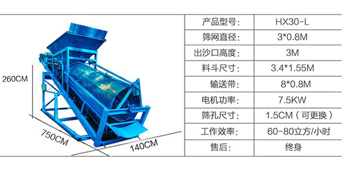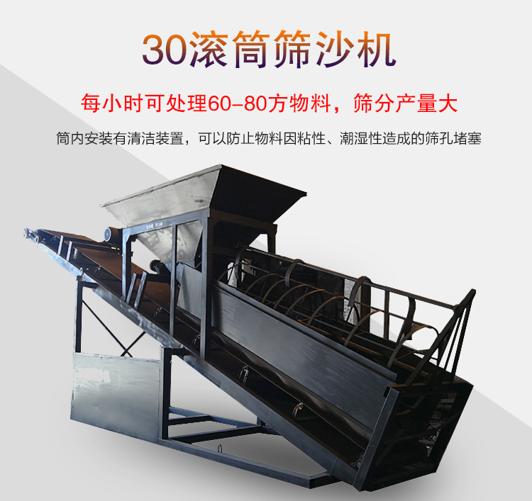 30滾筒篩沙機為標準版的篩沙機,處理量是60-80方/小時,料斗尺寸為3.4*1.55米,篩網(wǎng)直徑為3*0.8米,出料口高度為3米,電機功率為7.5kw。